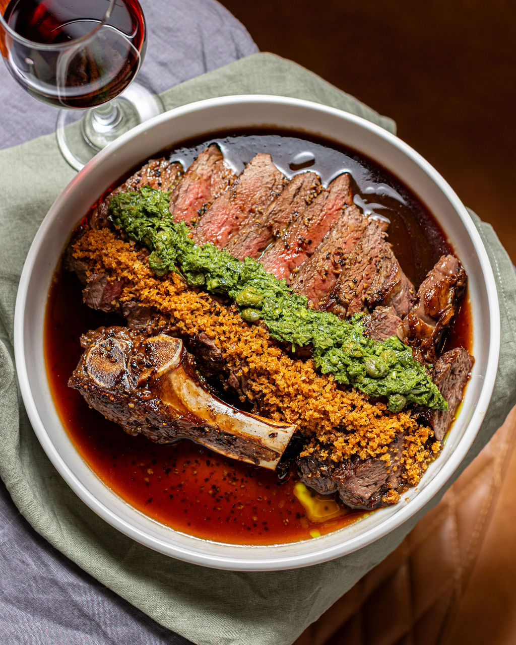 Enjoy a generous 500g ribeye steak, served with bottomless fries, chimichurri and a selection of house-made sauces — simple, generous and full of flavour.